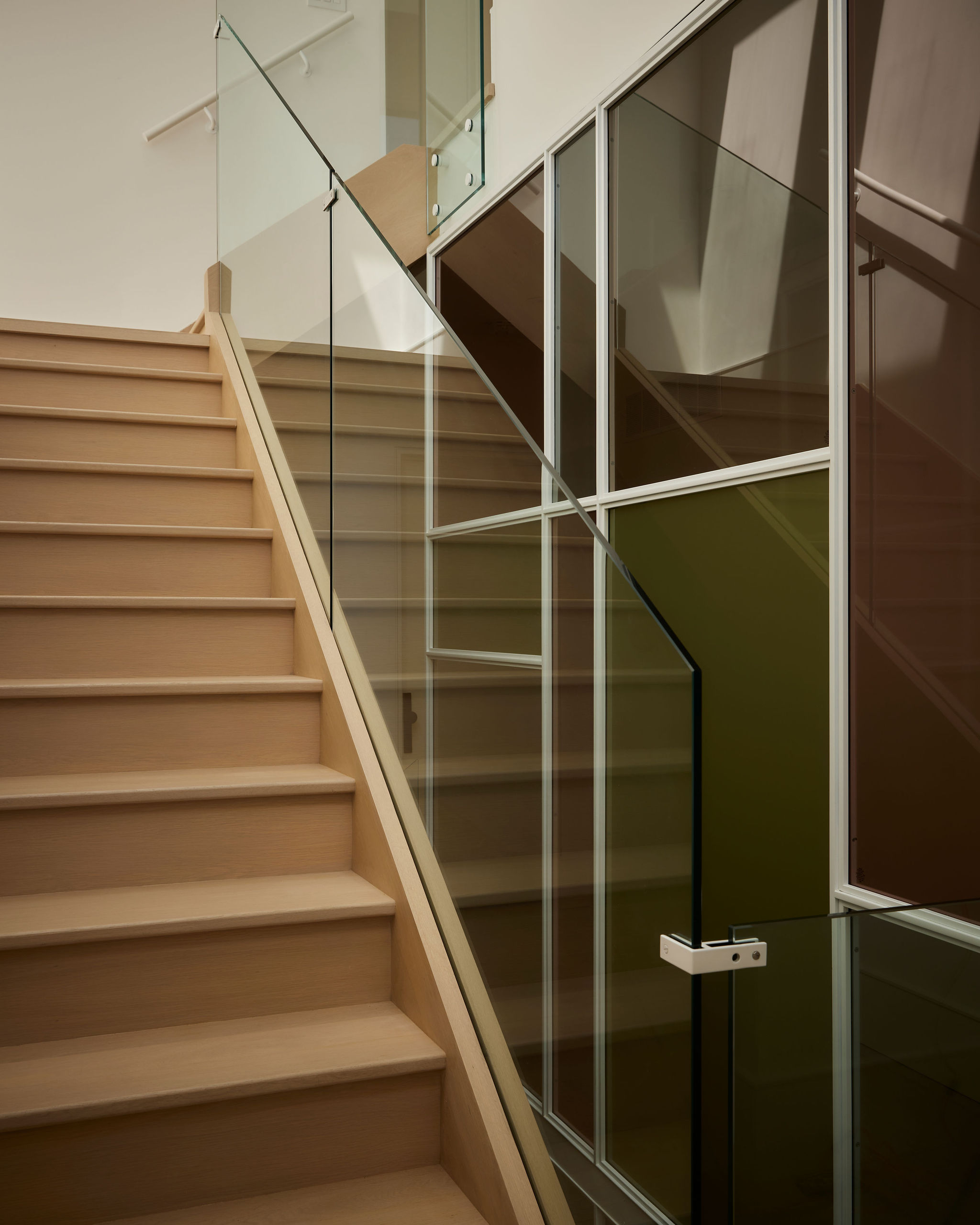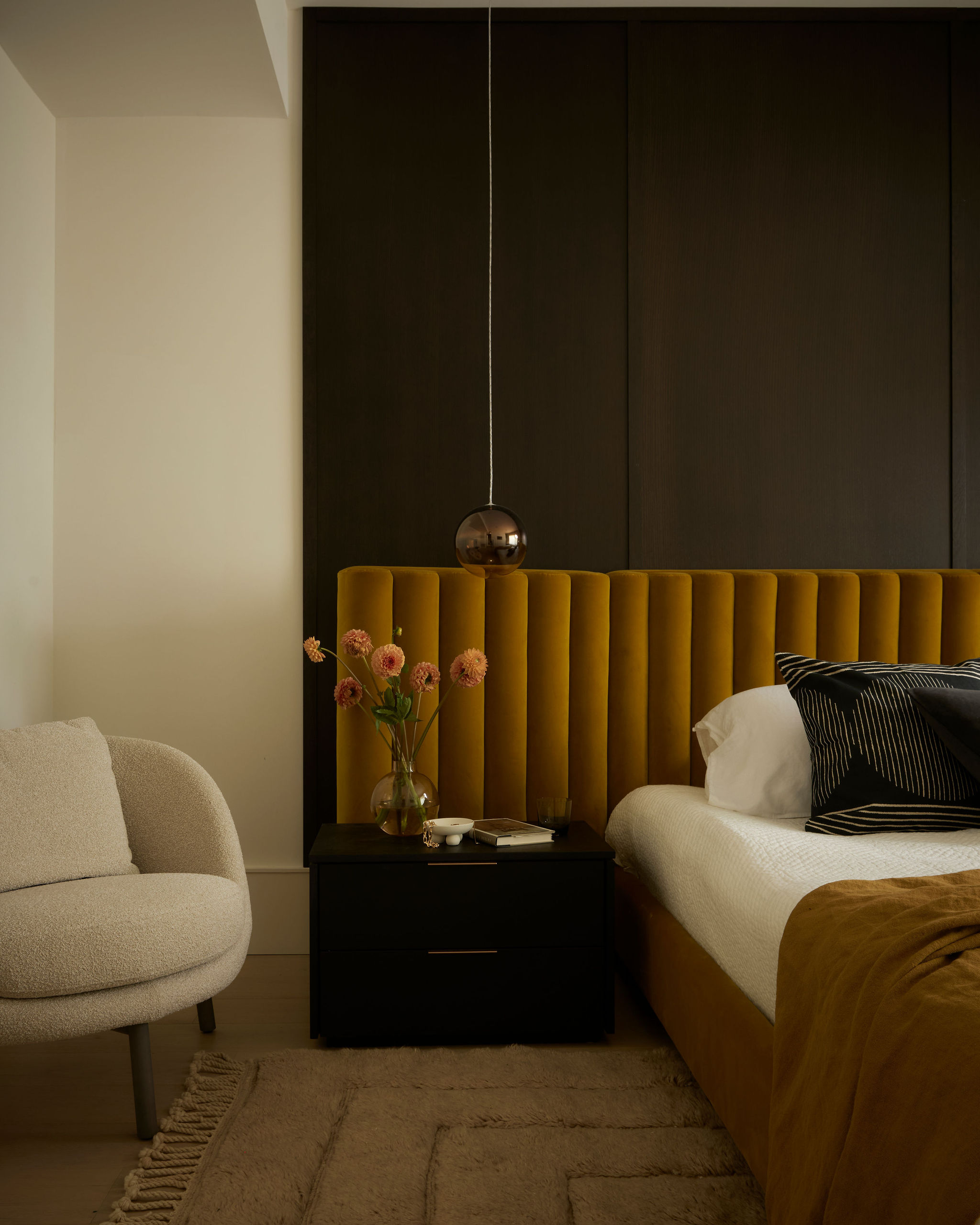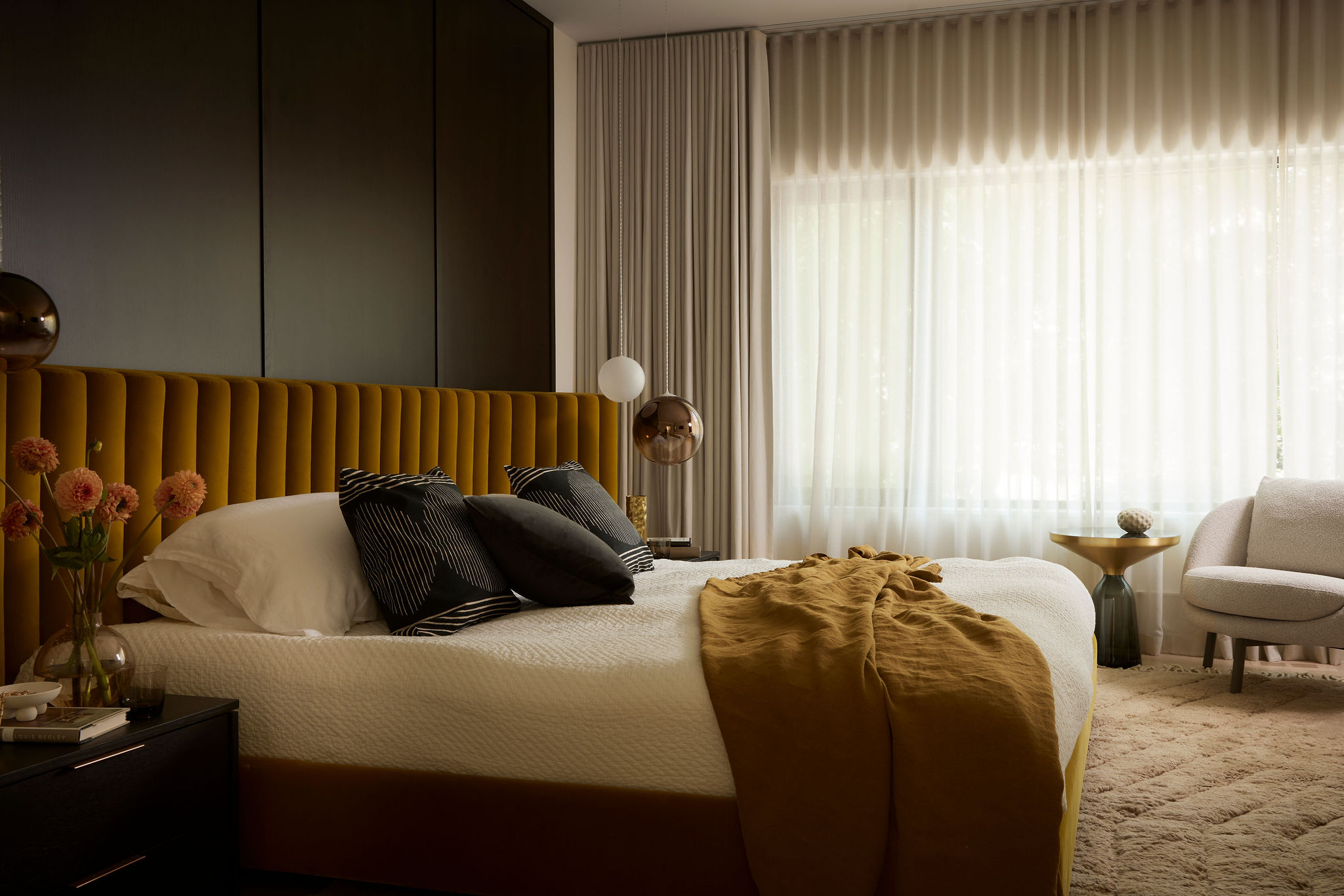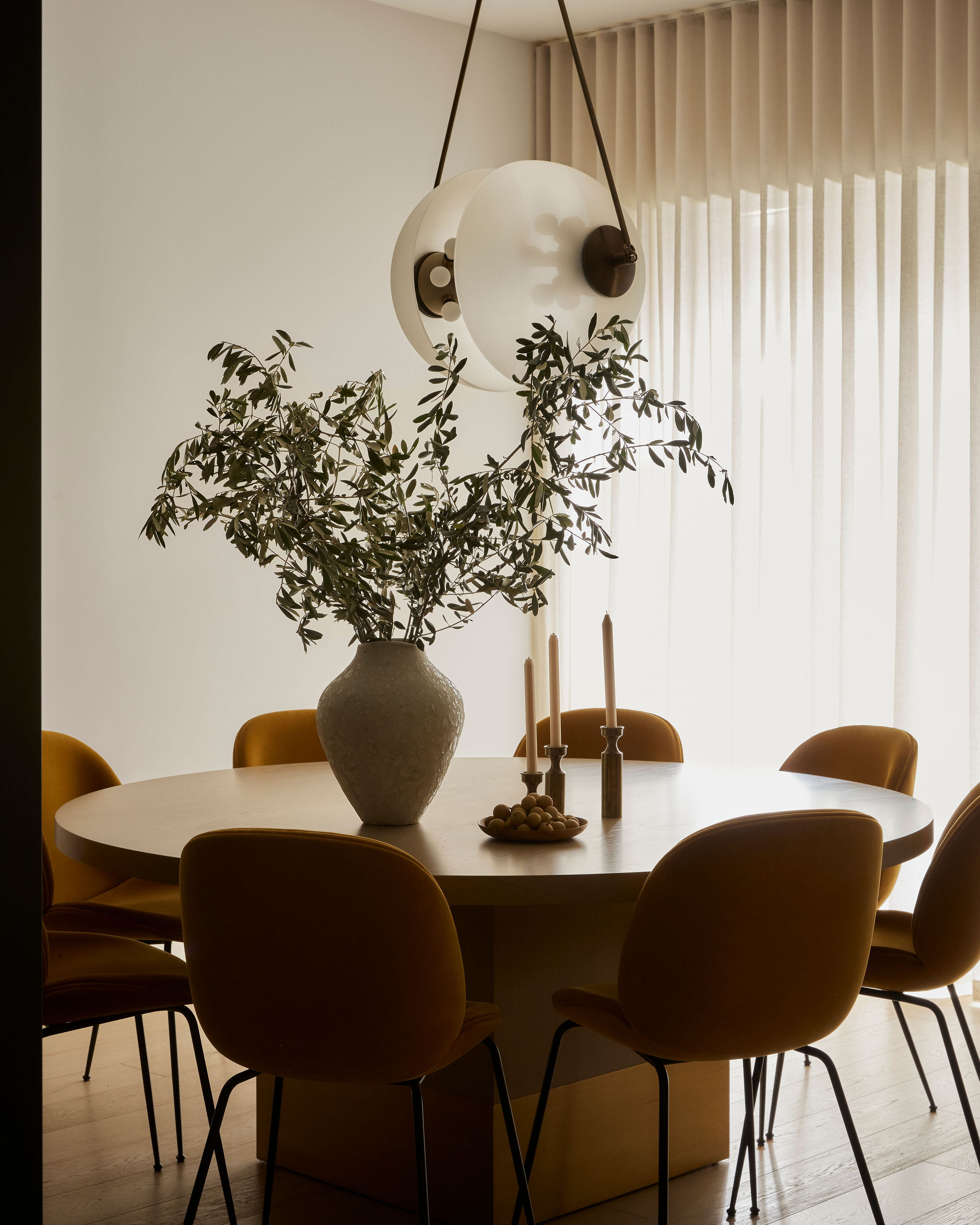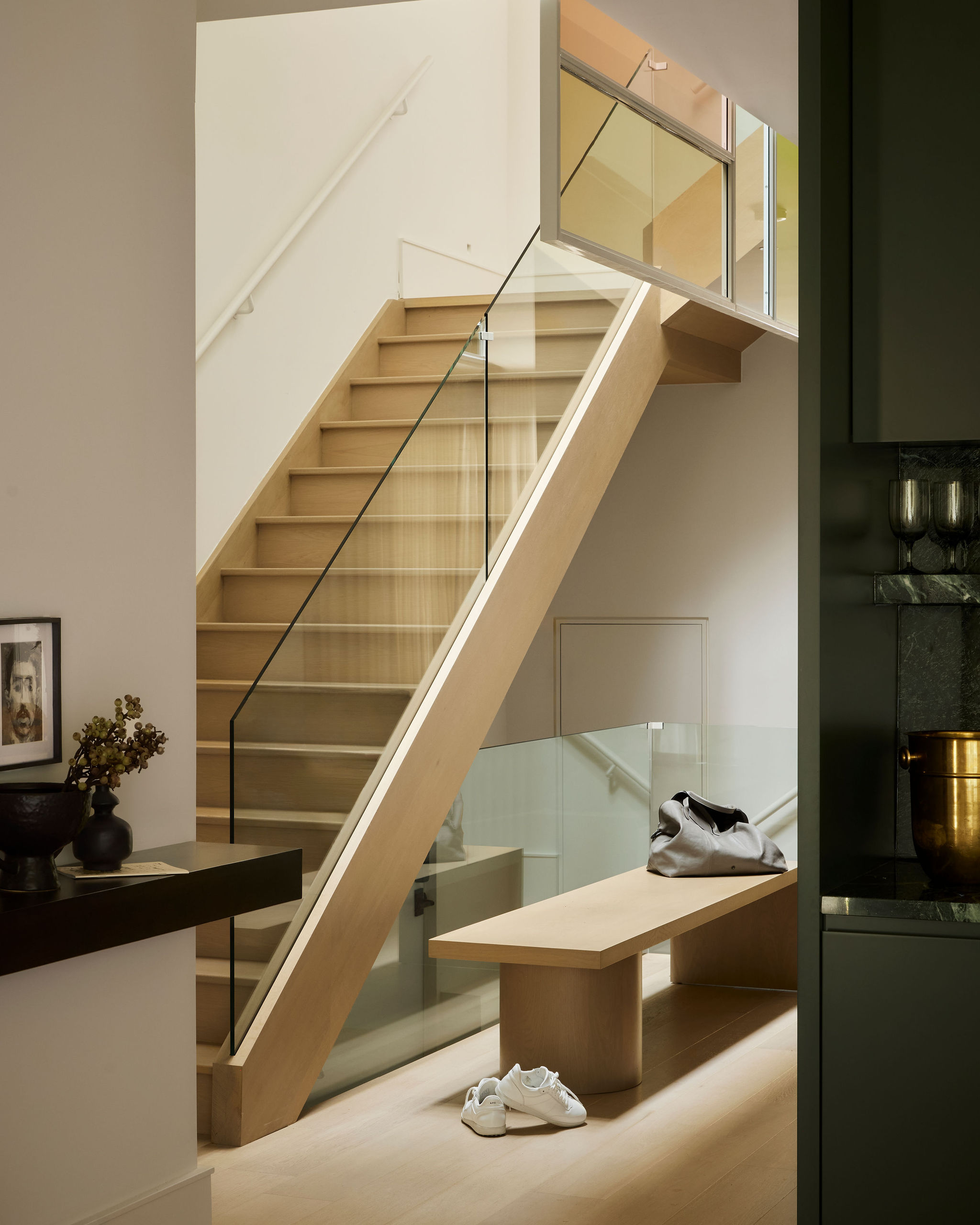 The result is a home where every space tells a story — from the three-storey glass guardrail to the citron velvet dining chairs, dusty pink plaster walls, and bespoke velvet headboard. It feels vibrant and timeless, refined yet deeply personal.