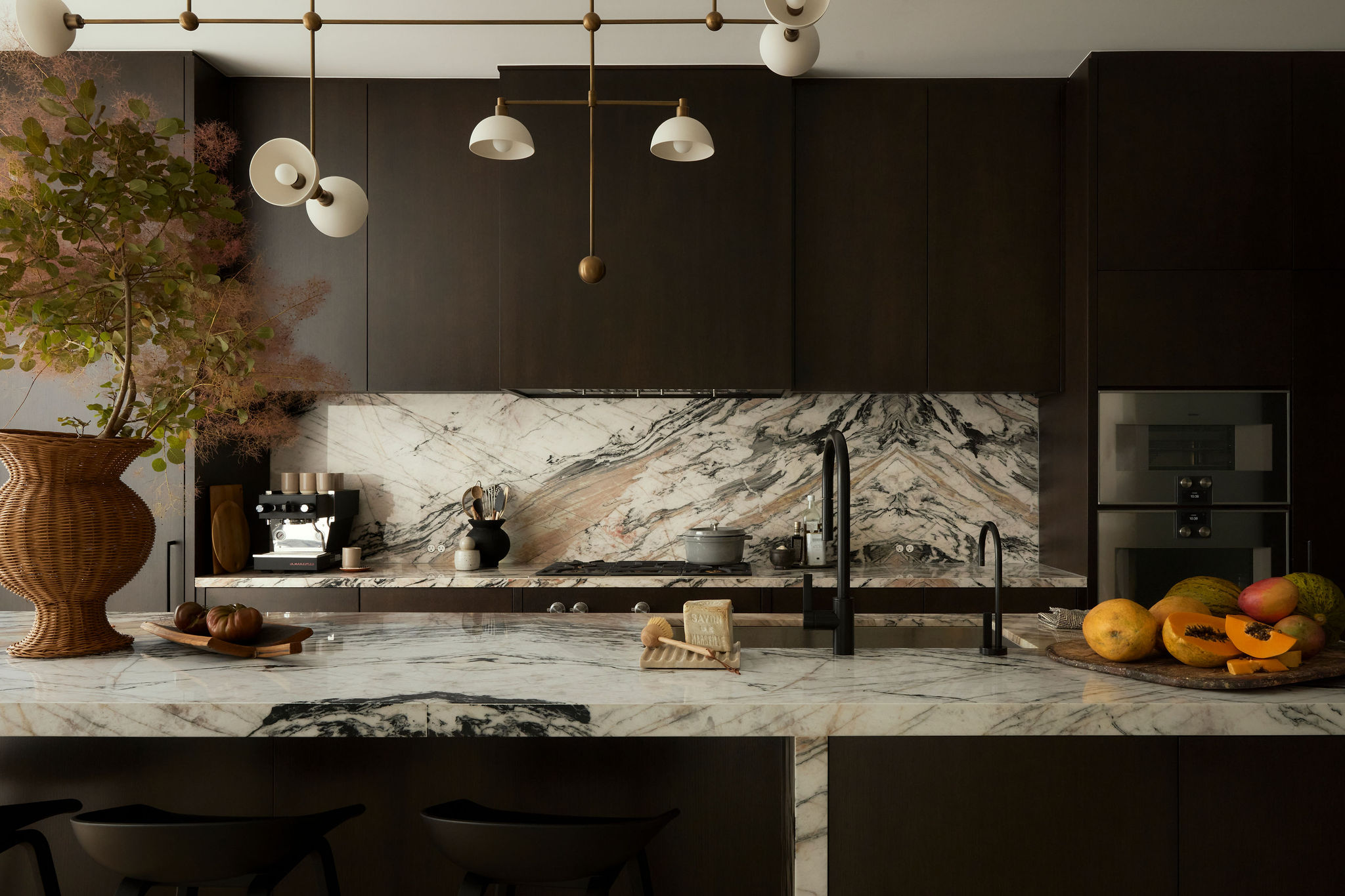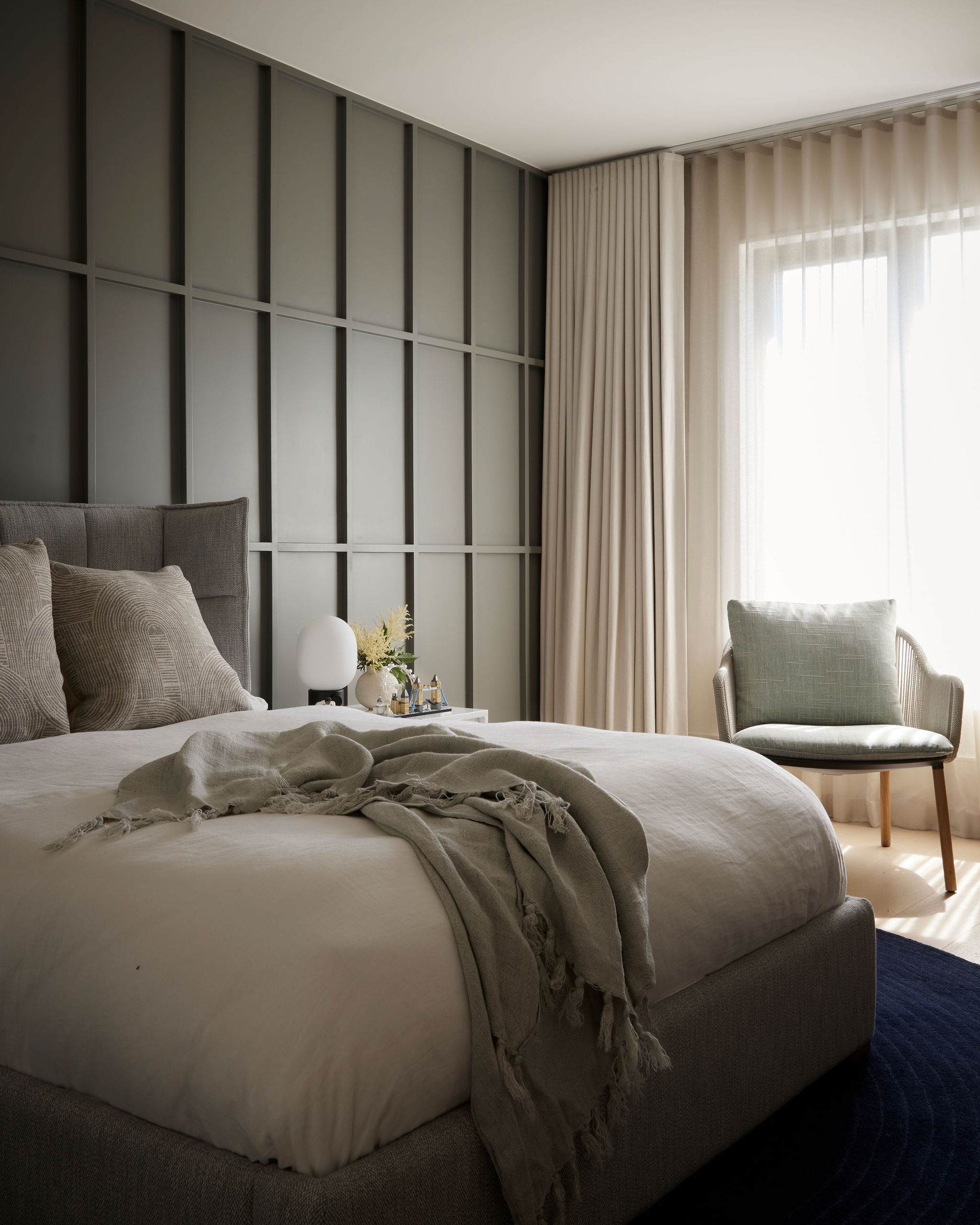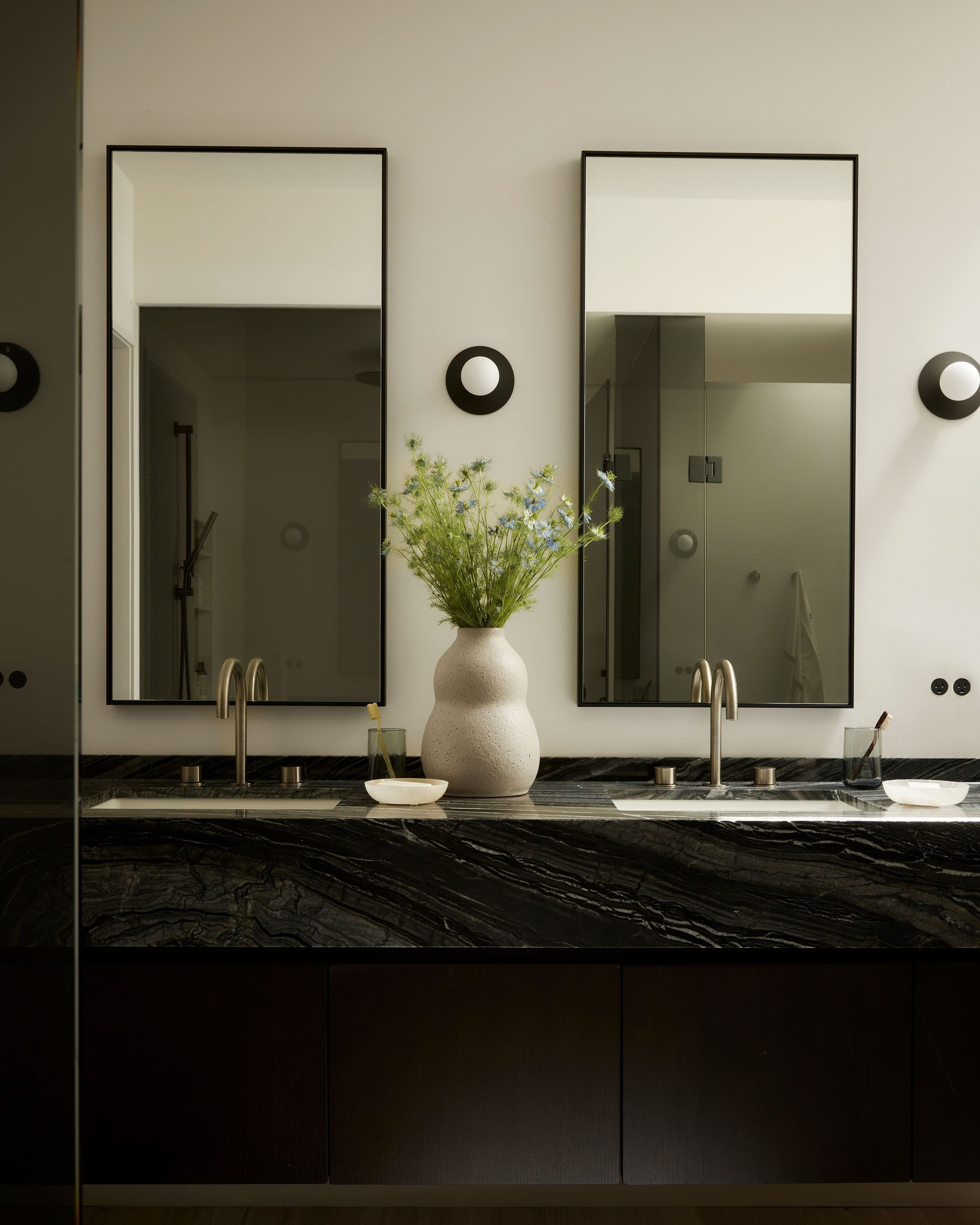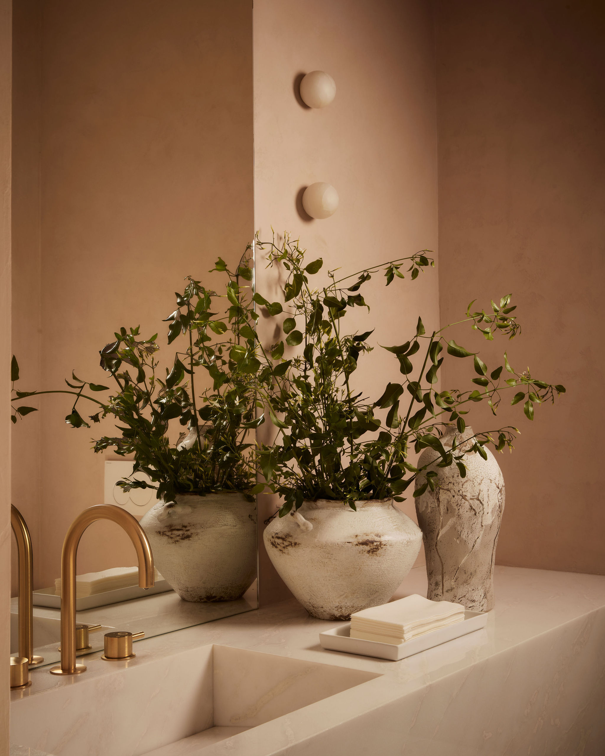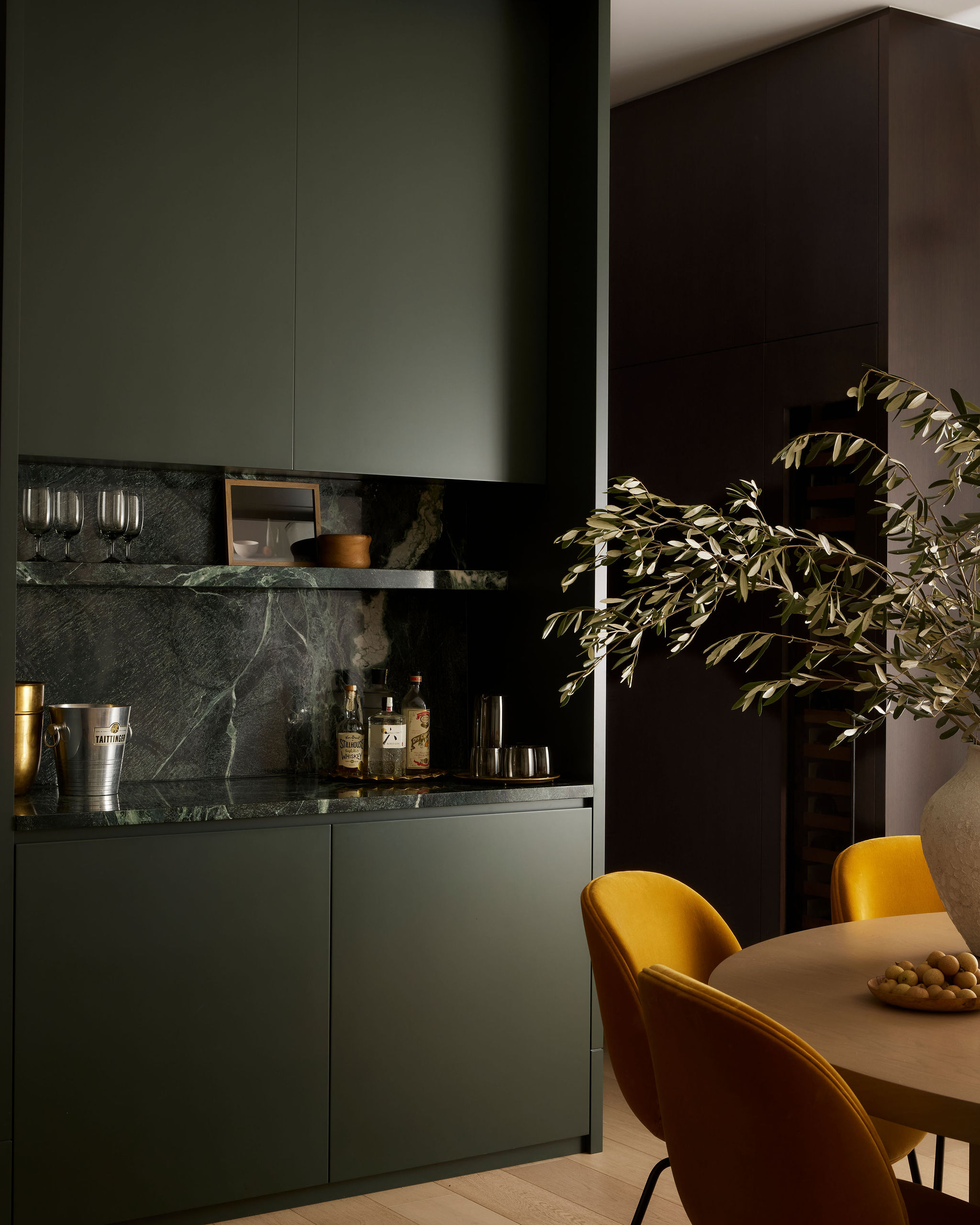 The result is a home where every space tells a story — from the three-storey glass guardrail to the citron velvet dining chairs, dusty pink plaster walls, and bespoke velvet headboard. It feels vibrant and timeless, refined yet deeply personal.